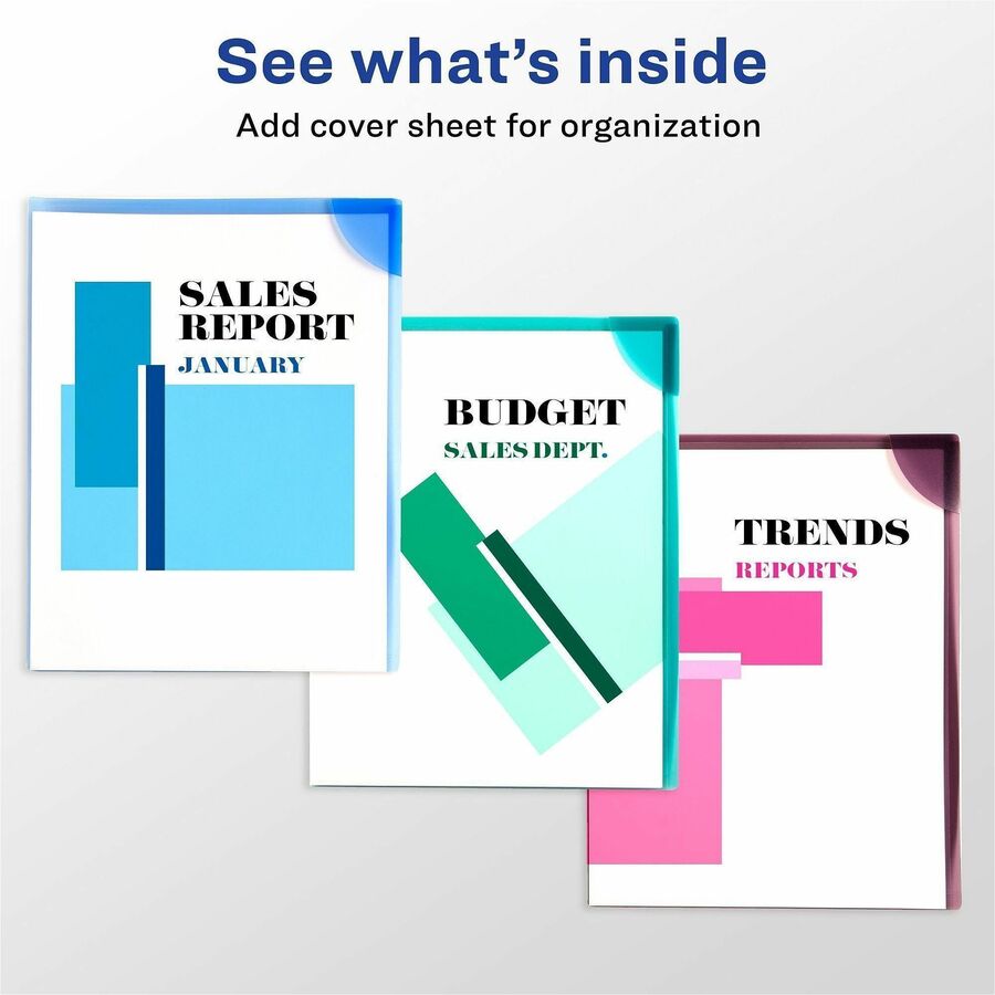 Hold and secure important documents with Avery Corner Lock Document Sleeves. Each plastic sleeve can easily store a variety of documents including letter-sized paper, photos, tickets, brochures, and receipts. These folder plastic sleeves feature two sealed sides that provide easy page access and protection. These plastic sleeves feature 2 corner document tabs designed to hold and secure your sheets. Keep your pages in pristine condition as the sturdy plastic material helps protect against damp surfaces, dirt, markings, scratches, and crumpling. This non-stick poly material is also designed to not lift print from your sheets. Use the sleeve as a travel document organizer as the thin, lightweight design allows for easy portability. The box includes 3 unique colored translucent back sleeves designed for easy, color-coding organization. Each sleeve features a clear front cover that allows you to add a title page. Whether your documents are for school, home, or work, use the predesigned binder templates and designs at avery.com to create your own cover page. Each plastic document sleeve can hold up 20 sheets of 8-1/2" x 11" paper. The assorted pack of 6 document sleeves include 2 blue, 2 green, and 2 purple sleeves. More from the Manufacturer |