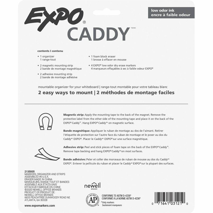 | Marketing Information | Capture ideas, share information and organize life with EXPO Dry-Erase Markers Kit. This vibrant marker collection helps everything come across clearly - from big ideas to fine details. Vibrant ink makes it easier to read information from a distance. Presentation markers are made for the whiteboard and beyond with ink that pops on glass, acrylic and other clear, nonporous surfaces. They're perfect for planning, presentations, lessons, calendars, home organization and more. Plus, the wide color range of these whiteboard markers adds versatility and personalization to any of your marking. Accent with a colorful doodle or sketch if you're a teacher or parent. This kit includes an EXPO eraser to easily and cleanly erase and a mountable organizer with mounting strips that stores all your items. |