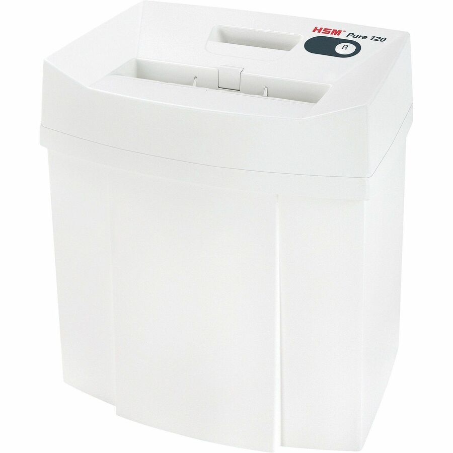 | Marketing Information | Pure 120 Strip-Cut Shredder features a compact design to shred up to 12 sheets of personalized advertising, correspondence of all kinds, receipts and payment documents safely and reliably right at your desk. Hardened steel cutting rollers easily cope with staples and paper clips. To keep your operating cost at a minimum, this shredder does not consume any power in standby mode. Paper feed with overload protection reduces paper jams and sustains the high throughput of paper. A slight pressure on the safety element immediately stops the paper feed and prevents unintentional entry into the machine for safe use. Automatic operation starts on its own when fed with paper and automatically stops after your shredding is complete. Quiet operation minimizes noise development to prevent distracting others in quiet locations. Removable housing top allows you to quickly empty the 5.3-gallon bin for effortless disposal. |