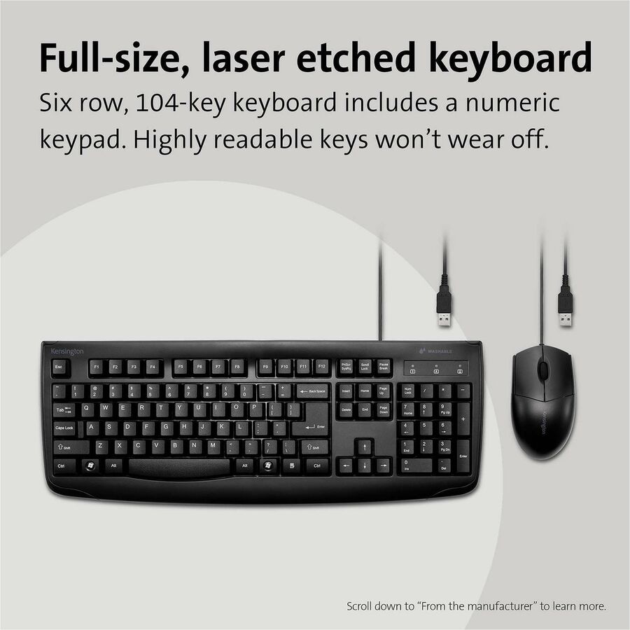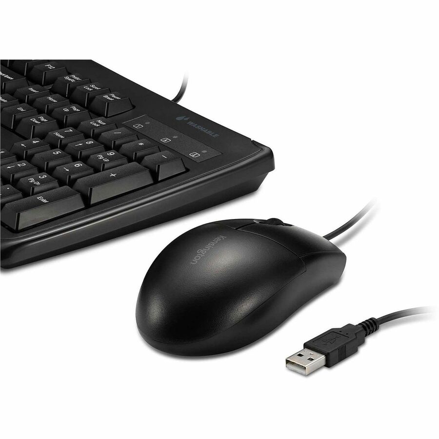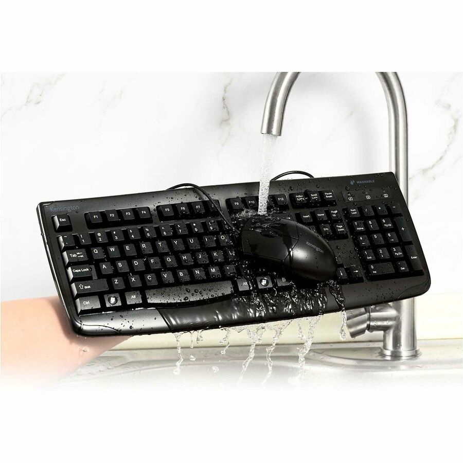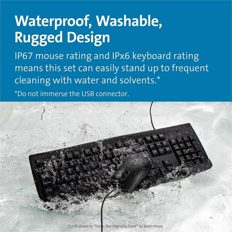 | Marketing Information | With a waterproof, washable and rugged design, the Pro Fit Wired Washable Keyboard and Mouse Set can safely stand up to immersion or frequent use of spray cleaners. It helps you maintain a hygienic surface and clean up drips and spills without sacrificing performance. The IP67 mouse rating and IPx6 keyboard rating mean this set can easily stand up to frequent cleaning with water and solvents. Full-size, 104-key keyboard with six rows includes a numeric keypad. Laser-etched keys feature highly readable letters that won't wear off. Contoured construction and three-button scroll wheel setup for the mouse provide a comfortable experience for left-handed and right-handed users. High-definition, 1600 dpi optical sensor tracks the mouse's movements with smooth accuracy. Plug-and-play, wired, USB connection delivers reliable performance. Keyboard and mouse are ideal for home, office, education, hospital/medical environments or retail. |