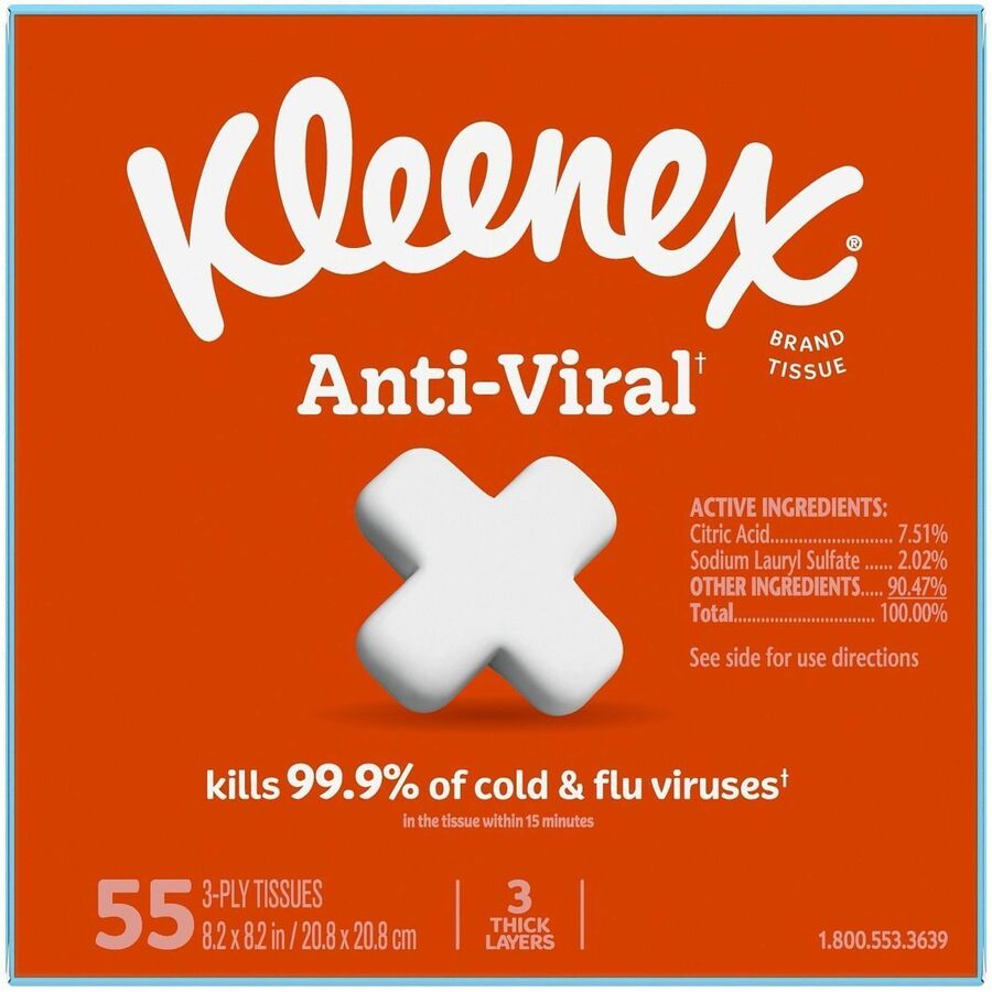 | Marketing Information | Because cold and flu viruses are often spread by hand contact, Kleenex brand has developed a tissue for your whole business. Each anti-viral tissue has three soft layers, including a moisture-activated middle layer that kills 99.9 percent of cold and flu viruses in the tissue within 15 minutes. It's virucidal against Rhinoviruses Type 1A and 2, Influenza A and B, and Respiratory Syncytial Virus. Each box comes with germ-fighting tissues, and each tissue features small blue dots on the interior layer to signal that they're antiviral. So whether you are a teacher caring for children, a commercial operator with a big staff or a business owner who cares about your employees' health, these antiviral facial tissues can be an important part of keeping your crew healthy year-round. |
