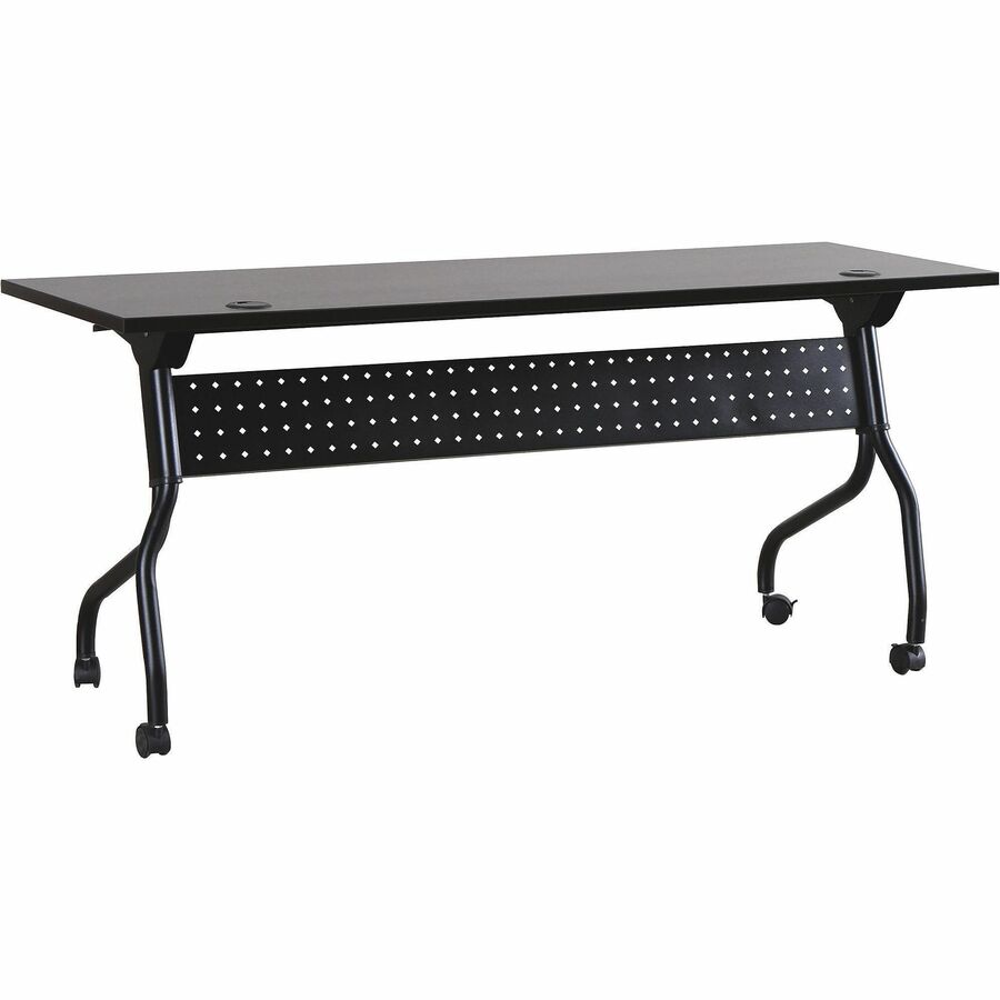 | Marketing Information | Part of the Lorell Preference Series, this versatile training table offers flexible configurations and convenient storage. Use individually or secure together into rows with a reliable metal connector (sold separately). Espresso top flips up for easy storage without having to remove the connector. Top features a melamine surface with a 3mm PVC straight edge. Two grommets allow easy cord management. Four-leg, all-metal black base features a one-way fold and modesty panel. Table rolls easily on four nylon casters with brakes. |