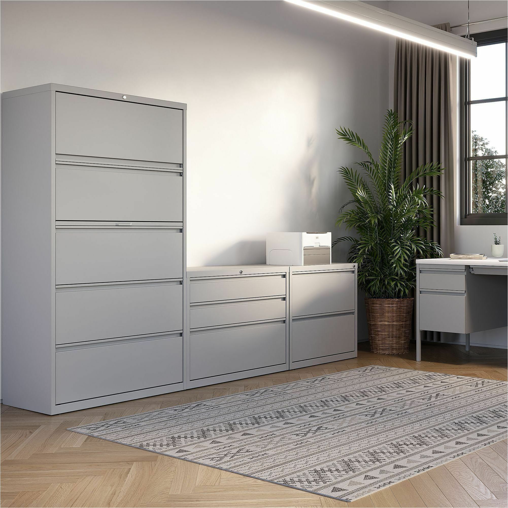 | Marketing Information | 36" wide lateral file features a roll-out binder storage/posting shelf and four drawers with hanging file rails for side-to-side filing in letter-size, legal-size or A4-size for versatility. Each drawer has a magnetic label holder for easy identification where you need it. Design also features a core-removable lock for security, dual locking bars, full-width pull, ball-bearing slide suspension for smooth opening and closing, reinforced base, and four adjustable leveling guides for stabilization. Interlock system prohibits the extension of more than one drawer at a time for your safety. Counterweight prevents tipping. Lateral file meets or exceeds applicable ANSI/BIFMA standards. |