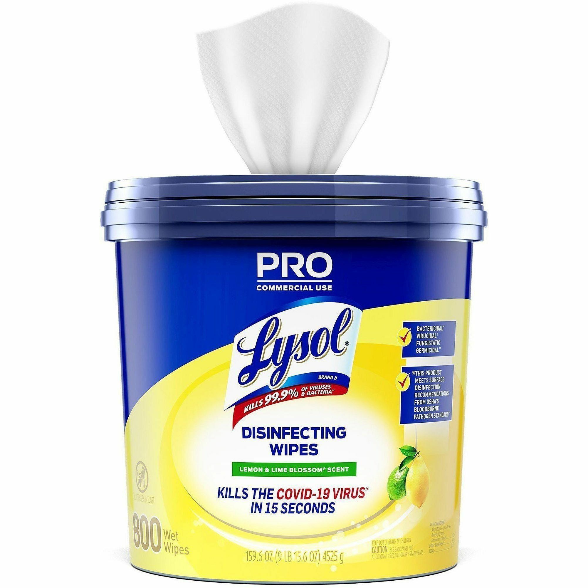 | Marketing Information | Optimize cleaning with high-capacity Lysol Professional Disinfecting Wipes that help you meet high-volume needs and reduce restock times for cleaning supplies. Pre-moistened disinfecting wipes kill 99.9 percent of viruses and bacteria, including the virus that causes COVID-19, when used as directed on hard, nonporous surfaces. Hospital-type disinfection works on a variety of surfaces, including electronics. Quickly clean and disinfect high-touch, germ hot spots to help protect your customers and staff. Clean up and keep moving with packaging that's easy to open, dispense and store. Wipes come in a handy bucket with a handle. |