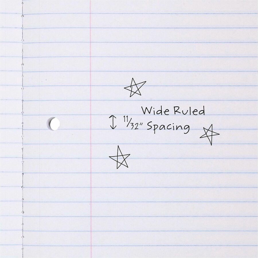 | Marketing Information | Wireless, one-subject notebook is three-hole punched for fast, easy organization. Perforated sheets allow simple paper extraction and keep the notebook neat. Wide-ruled paper provides ample space for simple note-taking. Coated front cover ensures the pages stay protected. |