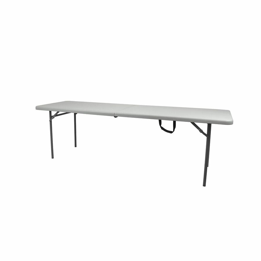Premium Seating Industrial Fold-in-Half Table merges unparalleled durability with robust, unobstructed design for heavy-duty applications - indoors or outdoors. High-density, blow-molded plastic tabletop features scratch-resistance to withstand wear-and-tear from daily use. Unique leg design, placed near table ends, replaces traditional wishbone legs for more spacious leg room and extra seating capacity. Versatile table provides ample space for various activities, from meetings to training sessions to community events. 18-gauge steel frame ensures stability on any surface to enhance safety. Easy setup requires no assembly - simply unfold the table in seconds. Tabletop measures 1.75" thick. |