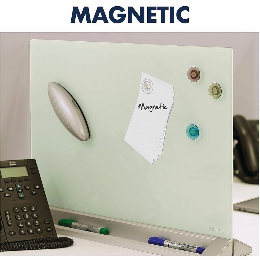 | Marketing Information | Dry-erase panel features a self-standing design to keep your notes and ideas at your fingertips. Tempered glass surface is resistant to stains and ghosting for complete erasability. Double-sided surface can also be used as a desk partition for versatile use. Magnetic surface doubles as personal bulletin board with rare earth magnets. Accessory channel provides storage for markers and pens. |