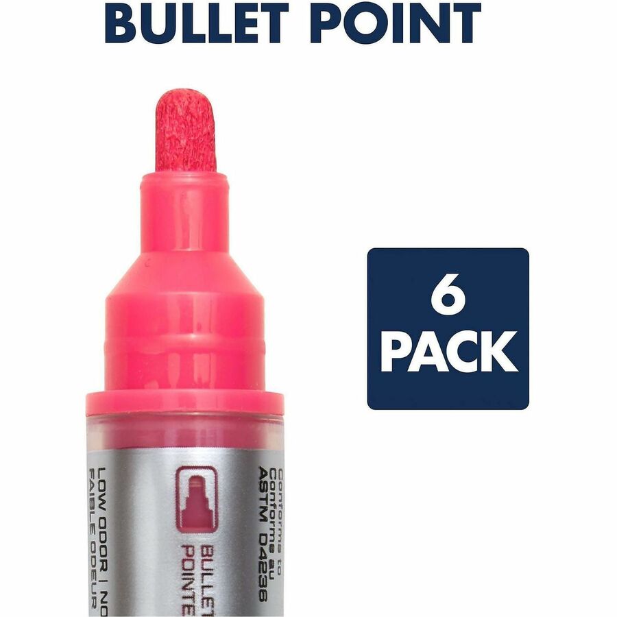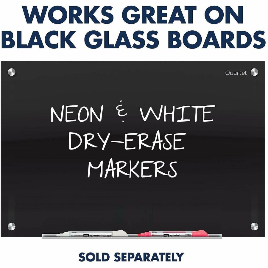 | Marketing Information | Markers feature bright, neon ink for excellent visibility on dark-colored and black glass boards. Pump-action, free-flowing ink delivery system ensures smooth laydown for consistent results. See-through ink gauge is located on the marker barrel to prevent unexpected runout. Bullet tip creates bold lines to ensure your message is visible on large glass boards. |