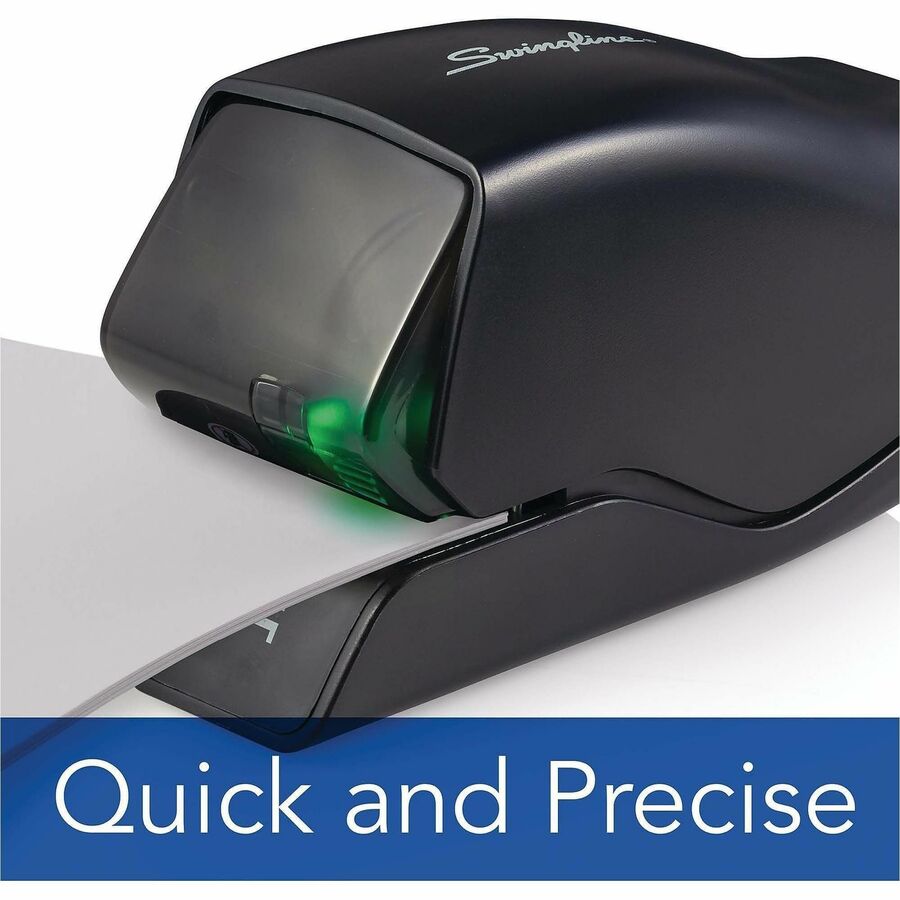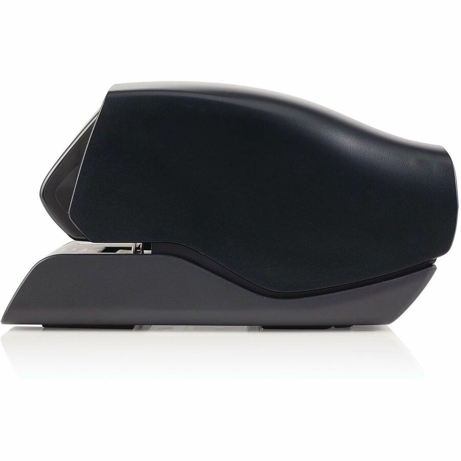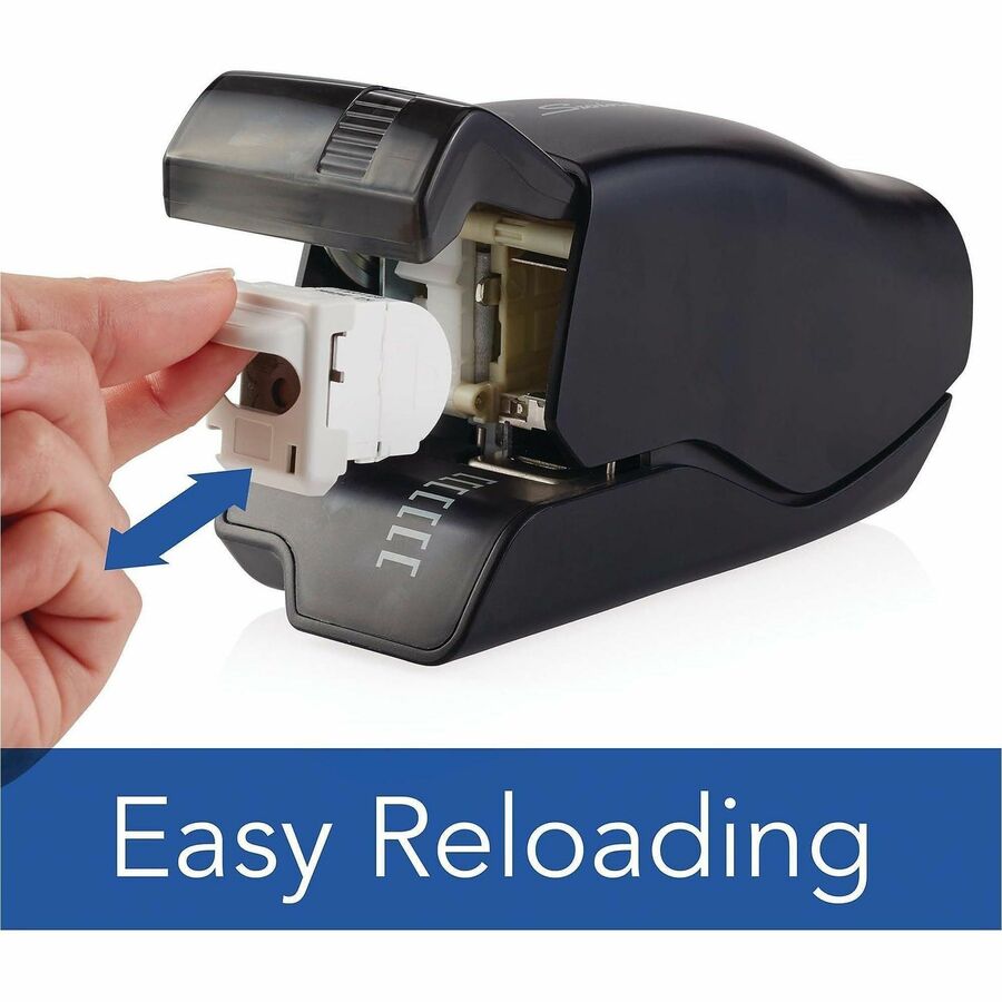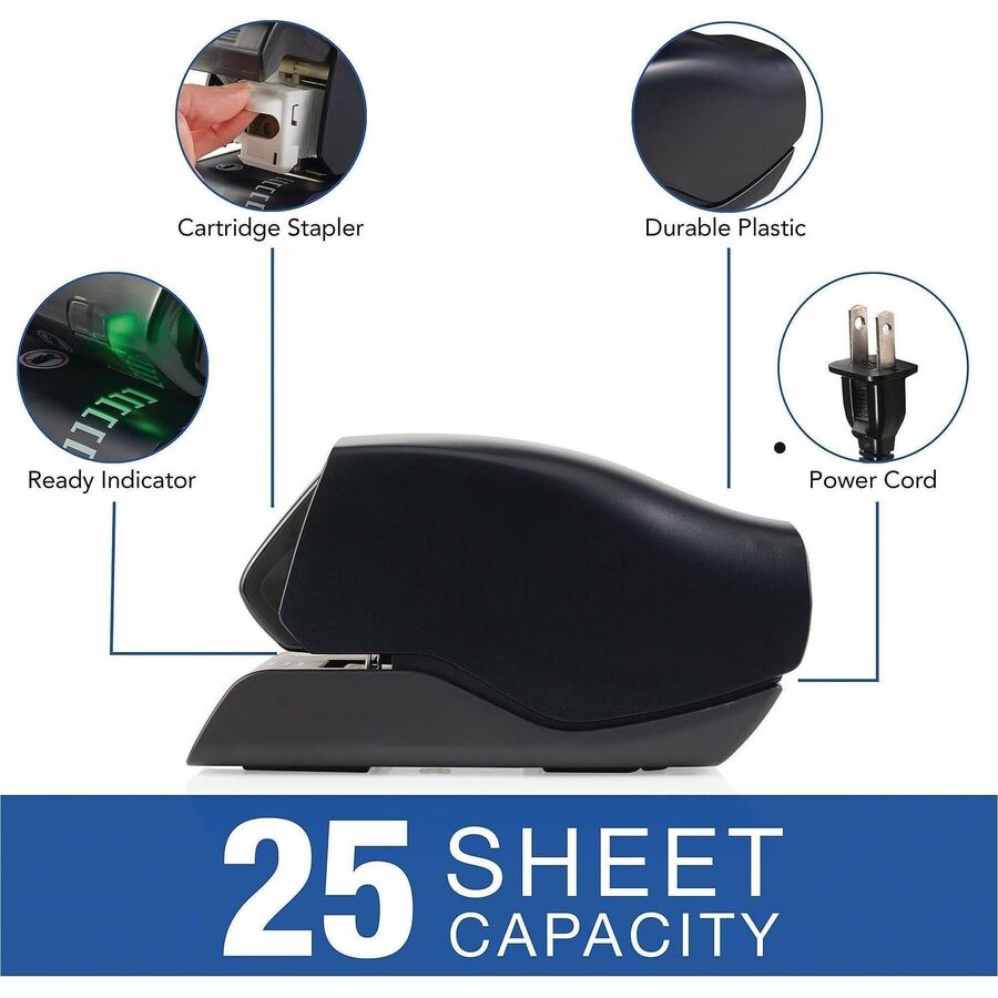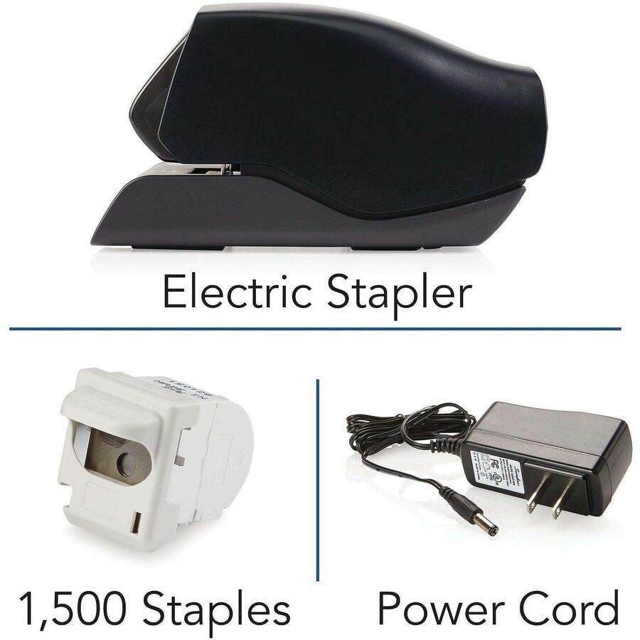 | Marketing Information | Electric stapler features cartridge stapling technology to effortlessly staple up to 25 sheets at a time. Flat-clinch design allows your stapled pages to lie flatter on top of each other for reduced bulk. Its large-capacity cartridge provides 1,500 staples for convenient use in busy environments. LED guiding light shows you exactly where the staple will fasten for consistent use. Plus, its extremely quiet operation prevents distracting those around you in quiet environments. |