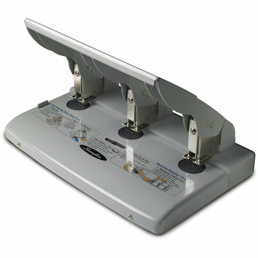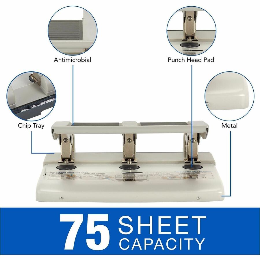 | Marketing Information | High-capacity, heavy-duty punch increases productivity by cleanly punching three holes in as many as 75 sheets. Metal construction and one-touch punch pad extend the life of the punch itself and the punch heads. Heavy-duty punch is protected with antimicrobial treatments that help preserve the integrity of plastic areas and dry coatings on metal parts by preventing the growth of bacteria and mold. |