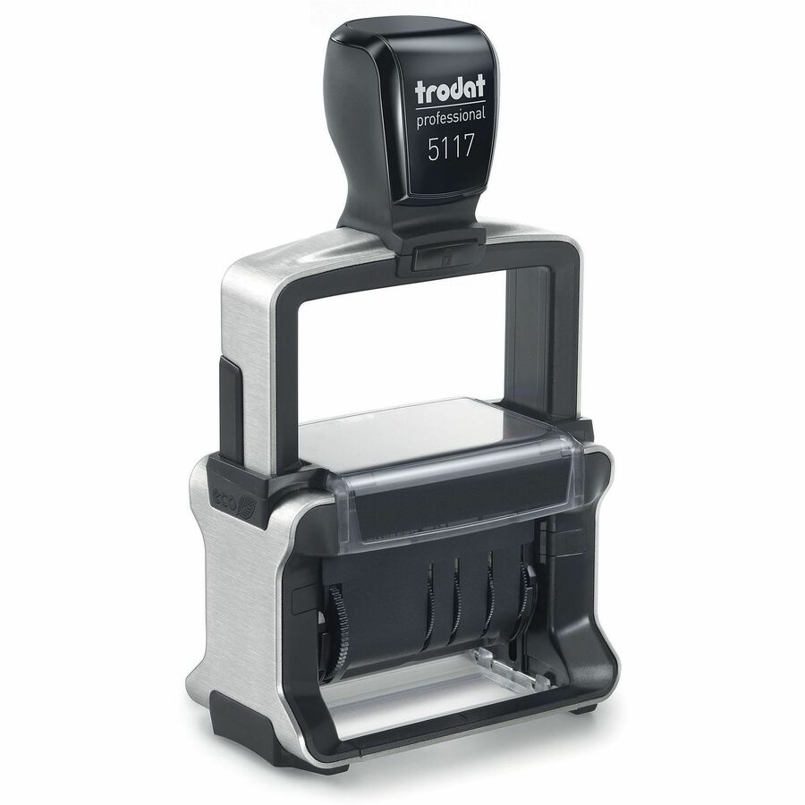| Marketing Information | Professional date stamp is designed to keep pace with an active office. Heavy-duty dater imprints the date after one of 12 popular phrases: ANSWERED, BACKORDERED, CANCELLED, BILLED, RECEIVED, EMAILED, CHECKED, DELIVERED, ENTERED, PAID, SHIPPED and FAXED. Four bands produce 10 years of dates. Date band cover ensures your fingers remain clean. Impression size is 3/8" x 2-1/4". Stamp delivers 10,000 impressions. The frame is made of steel. |