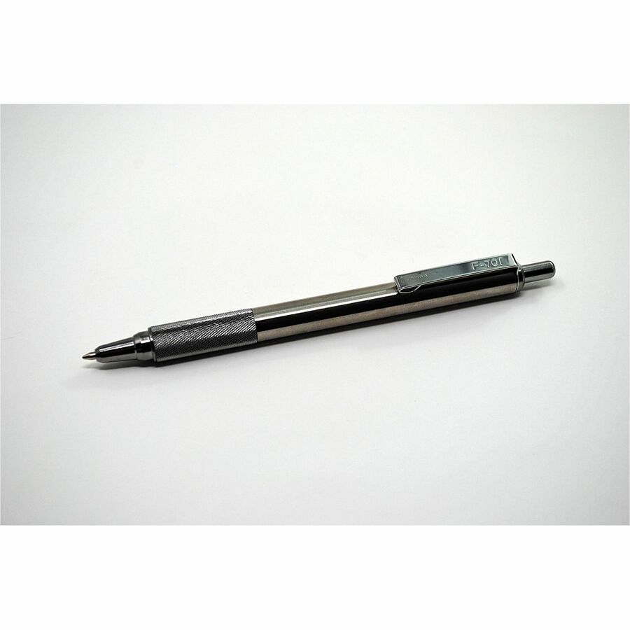 | Marketing Information | F-701 Retractable Ballpoint Pen is made of professional-grade stainless steel from tip to clip. It is designed to prevent corrosion. Easy-to-hold knurled metal grip provides writing stability. Quiet plunger mechanism silences any clicking when you retract. Pen with black ink is refillable with Zebra F-Refill. |